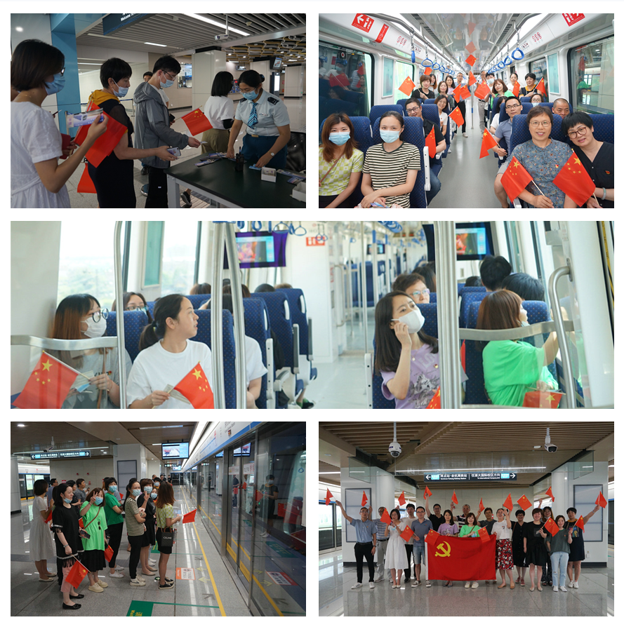下午1:20,黨員職工們在大廈底樓集合,一起興高采烈出發(fā)至皮革城站入口,換票、安檢、檢票進(jìn)站后,踏上了杭海城際鐵路的試乘旅途。大家手舉小紅旗,激動之情溢于言表。