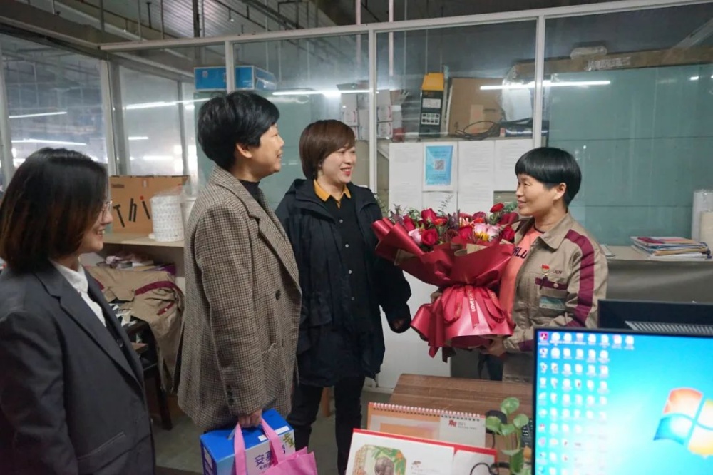 11月11日,斜橋鎮(zhèn)婦聯(lián)主席蔡丹薇等在集團(tuán)婦聯(lián)主席顧麗萍的陪同下到斜橋廠區(qū)慰問“全國三八紅旗手”、“浙江省勞?!崩蠲魅A,給她送去了鮮花和問候。
