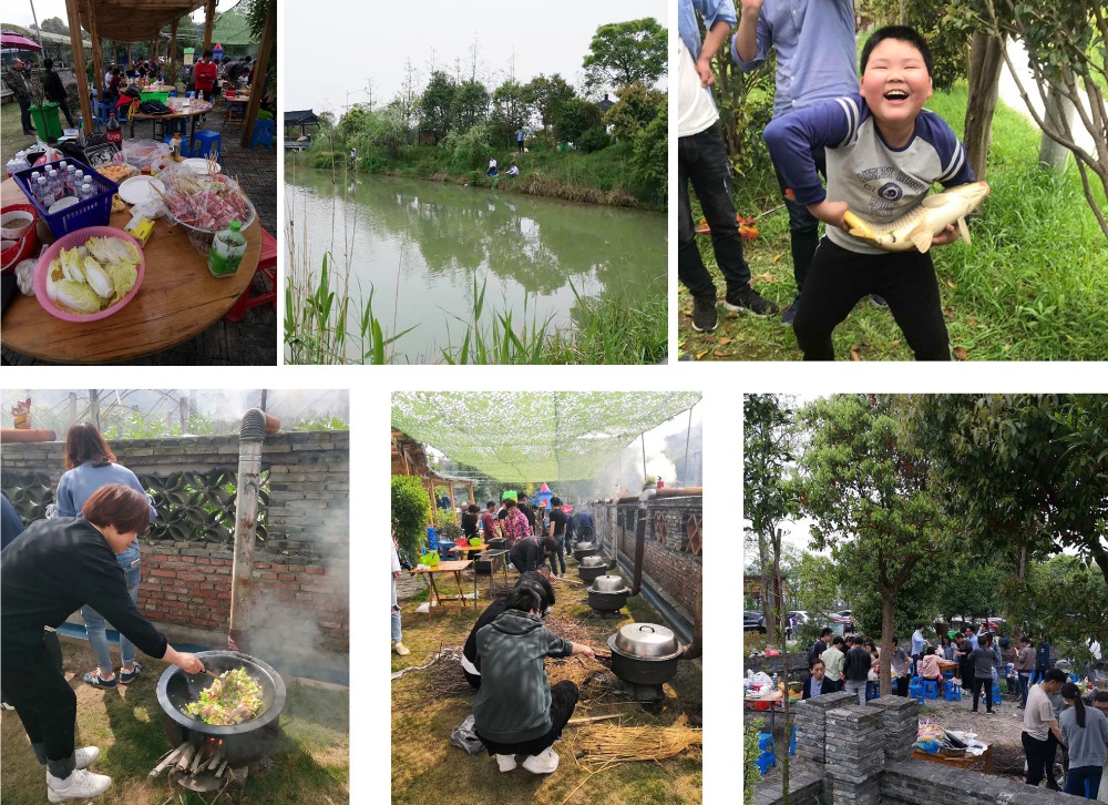 這次活動的地點是尖山金家農莊,那里景色秀麗,有蜿蜒的長廊,荷蘭風車,孩童玩的滑滑梯,共有大人小孩100多人參加了活動。喜歡釣魚的一大早趕到農莊,拿出自己的優(yōu)良漁具占領有利地勢,拋出桿,開始享受釣魚的快樂。莊主家也早已經(jīng)幫助準備好了食材,年長一點的員工都有燒飯的經(jīng)驗,尤新仙、沈利仙、俞建強等組員負責燒野飯,在農家的土灶上,燒起了柴火,一個個大大的鐵鍋里,放上油,炒起了咸肉、春筍、蠶豆、豌豆、香腸,菜炒熟后放上米和水,隨著時間的推移,隨之而來的香噴噴的野飯味撲鼻而來;年輕一點的負責燒烤,大家分工明確,團結協(xié)作,雖然大家是新手,但是還是有不少人參加過燒烤活動,有一點點經(jīng)驗的,在其中儼然就成了師傅,爭著做起了大師傅,把烤串刷上油、香料烤了起來,燒烤網(wǎng)上烤串放得滿滿的,引得旁人垂涎三尺紛紛投來羨慕和貪婪的眼光。每組烤的骨肉相連、羊肉串、雞翅等一一出爐,大家相互吆喝著請其他組人員來吃自己家烤的東西,紛紛夸贊自己組烤得好吃??镜摹⒊缘?、串門的、看的、拍照的,每個人都樂在其中……